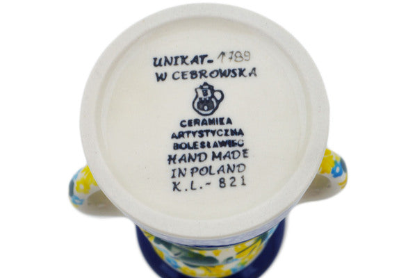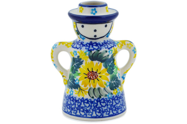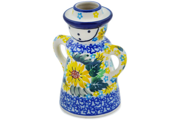 This Sunflower Surprise 5" Candle Holder was handmade and hand decorated in Boleslawiec, Poland by skilled artisans according to old traditional methods. This is a Polish pottery Signature Unikat, which means that it has been hand painted with both sponges and brushes and it is signed by the artist who painted it. Unikat pieces are the most intricate works of art. Larger Unikat items take hours of very careful work to finish. This Polish stoneware is microwave, dishwasher, freezer, and oven safe up to 480°F. It does not contain lead or cadmium. It is part of the Sunflower Surprise Collection.