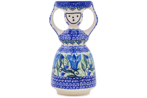 This Gentian Wreath 6" Candle Holder was handmade and hand decorated in Boleslawiec, Poland by skilled artisans according to old traditional methods. This is a Polish pottery Signature Unikat, which means that it has been hand painted with both sponges and brushes and it is signed by the artist who painted it. Unikat pieces are the most intricate works of art. Larger Unikat items take hours of very careful work to finish. This Polish stoneware is microwave, dishwasher, freezer, and oven safe up to 480°F. It does not contain lead or cadmium. It is part of the Gentian Wreath Collection.