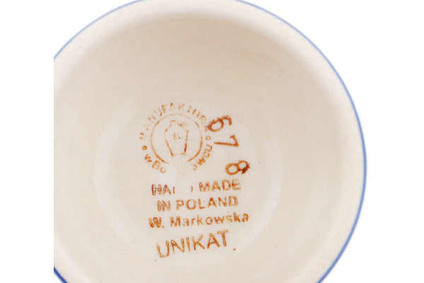 This Misty Blue 10 oz Cappuccino Glass was handmade and hand decorated in Boleslawiec, Poland by skilled artisans according to old traditional methods. This is a Polish pottery Signature Unikat, which means that it has been hand painted with both sponges and brushes and it is signed by the artist who painted it. Unikat pieces are the most intricate works of art. Larger Unikat items take hours of very careful work to finish. This Polish stoneware is microwave, dishwasher, freezer, and oven safe up to 480°F. It does not contain lead or cadmium. It is part of the Misty Blue Collection.