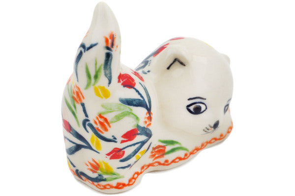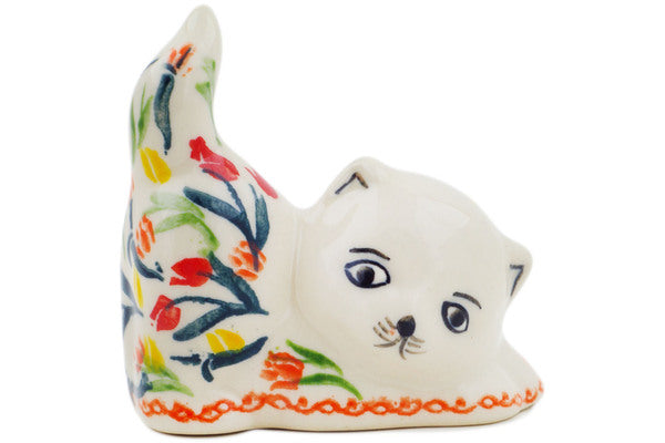 This Tulip Ring 3" Cat Figurine was handmade and hand decorated in Boleslawiec, Poland by skilled artisans according to old traditional methods. This Polish stoneware is microwave, dishwasher, freezer, and oven safe up to 480°F. It does not contain lead or cadmium. It is part of the Tulip Ring Collection.