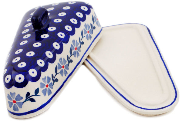 This Peacock Forget-Me-Not 8" Cheese Dish was handmade and hand decorated in Boleslawiec, Poland by skilled artisans according to old traditional methods. This Polish stoneware is microwave, dishwasher, freezer, and oven safe up to 480°F. It does not contain lead or cadmium. It is part of the Peacock Forget-Me-Not Collection.