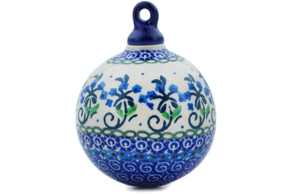 This Forget Me Not Circle 4" Christmas Ball Ornament was handmade and hand decorated in Boleslawiec, Poland by skilled artisans according to old traditional methods. This is a Polish pottery Signature Unikat, which means that it has been hand painted with both sponges and brushes and it is signed by the artist who painted it. Unikat pieces are the most intricate works of art. Larger Unikat items take hours of very careful work to finish. This Polish stoneware is microwave, dishwasher, freezer, and oven safe up to 480°F. It does not contain lead or cadmium. It is part of the Forget Me Not Circle Collection.