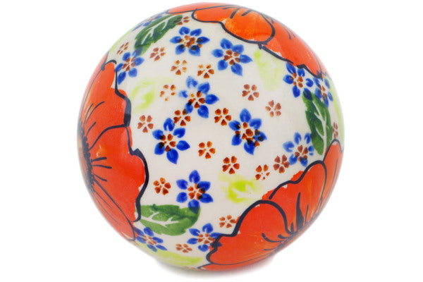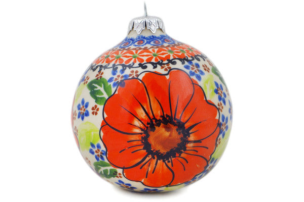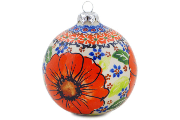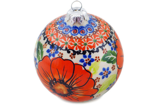 This Orange Zinnia 5" Christmas Ball Ornament was handmade and hand decorated in Boleslawiec, Poland by skilled artisans according to old traditional methods. This is a Polish pottery Signature Unikat, which means that it has been hand painted with both sponges and brushes and it is signed by the artist who painted it. Unikat pieces are the most intricate works of art. Larger Unikat items take hours of very careful work to finish. This Polish stoneware is microwave, dishwasher, freezer, and oven safe up to 480°F. It does not contain lead or cadmium. It is part of the Orange Zinnia Collection.