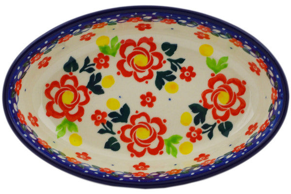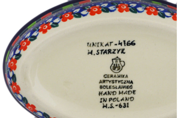 This Floral Puzzles 6" Condiment Dish was handmade and hand decorated in Boleslawiec, Poland by skilled artisans according to old traditional methods. This is a Polish pottery Signature Unikat, which means that it has been hand painted with both sponges and brushes and it is signed by the artist who painted it. Unikat pieces are the most intricate works of art. Larger Unikat items take hours of very careful work to finish. This Polish stoneware is microwave, dishwasher, freezer, and oven safe up to 480°F. It does not contain lead or cadmium. It is part of the Floral Puzzles Collection.