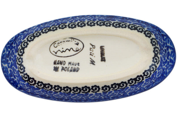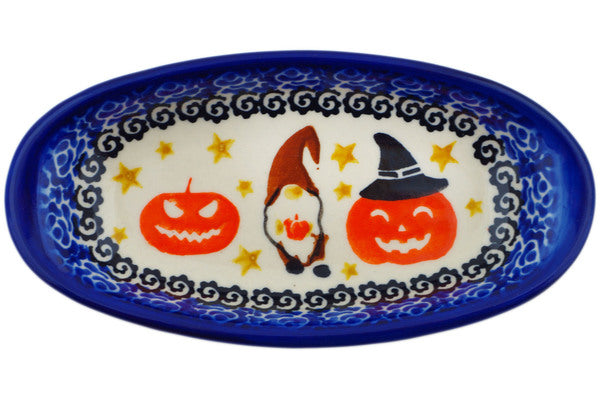 This Harvest Haunt 6" Condiment Dish was handmade and hand decorated in Boleslawiec, Poland by skilled artisans according to old traditional methods. This Polish stoneware is microwave, dishwasher, freezer, and oven safe up to 480°F. It does not contain lead or cadmium. It is part of the Harvest Haunt Collection.