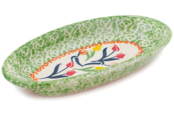 This Tulip Ring 6" Condiment Dish was handmade and hand decorated in Boleslawiec, Poland by skilled artisans according to old traditional methods. This Polish stoneware is microwave, dishwasher, freezer, and oven safe up to 480°F. It does not contain lead or cadmium. It is part of the Tulip Ring Collection.