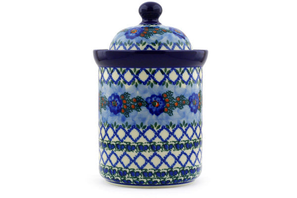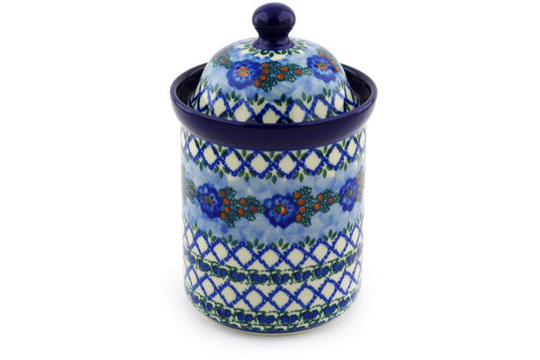 This Latice Daisy 8" Cookie Jar was handmade and hand decorated in Boleslawiec, Poland by skilled artisans according to old traditional methods. This is a Polish pottery Signature Unikat, which means that it has been hand painted with both sponges and brushes and it is signed by the artist who painted it. Unikat pieces are the most intricate works of art. Larger Unikat items take hours of very careful work to finish. This Polish stoneware is microwave, dishwasher, freezer, and oven safe up to 480°F. It does not contain lead or cadmium. It is part of the Latice Daisy Collection.