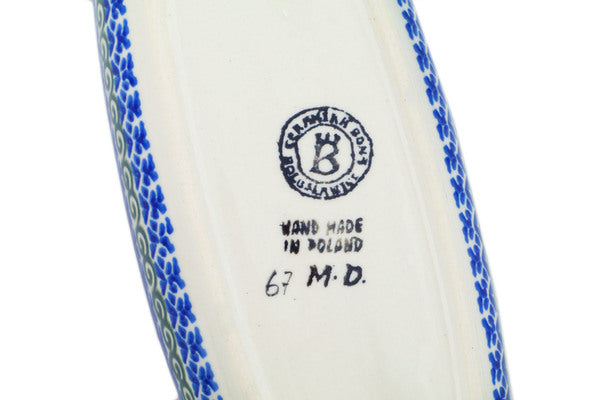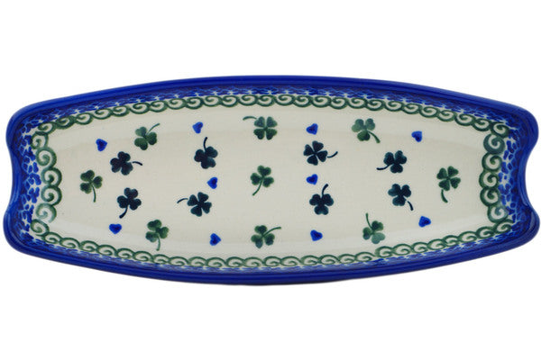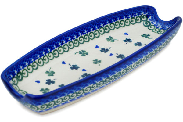 This Lucky Clovers 9" Corn Tray was handmade and hand decorated in Boleslawiec, Poland by skilled artisans according to old traditional methods. This Polish stoneware is microwave, dishwasher, freezer, and oven safe up to 480°F. It does not contain lead or cadmium. It is part of the Lucky Clovers Collection.