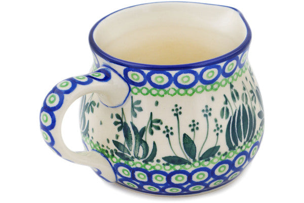 This Weeping Tulips 12 oz Creamer was handmade and hand decorated in Boleslawiec, Poland by skilled artisans according to old traditional methods. This is a Polish pottery Signature Unikat, which means that it has been hand painted with both sponges and brushes and it is signed by the artist who painted it. Unikat pieces are the most intricate works of art. Larger Unikat items take hours of very careful work to finish. This Polish stoneware is microwave, dishwasher, freezer, and oven safe up to 480°F. It does not contain lead or cadmium. It is part of the Weeping Tulips Collection.