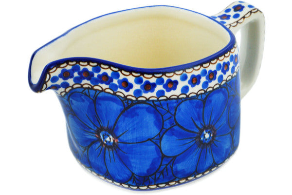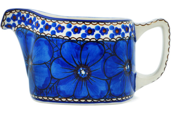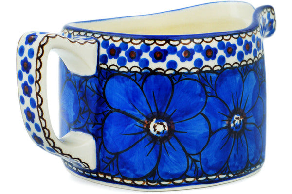 This Cobalt Poppies 13 oz Creamer was handmade and hand decorated in Boleslawiec, Poland by skilled artisans according to old traditional methods. This is a Polish pottery Signature Unikat, which means that it has been hand painted with both sponges and brushes and it is signed by the artist who painted it. Unikat pieces are the most intricate works of art. Larger Unikat items take hours of very careful work to finish. This Polish stoneware is microwave, dishwasher, freezer, and oven safe up to 480°F. It does not contain lead or cadmium. It is part of the Cobalt Poppies Collection.