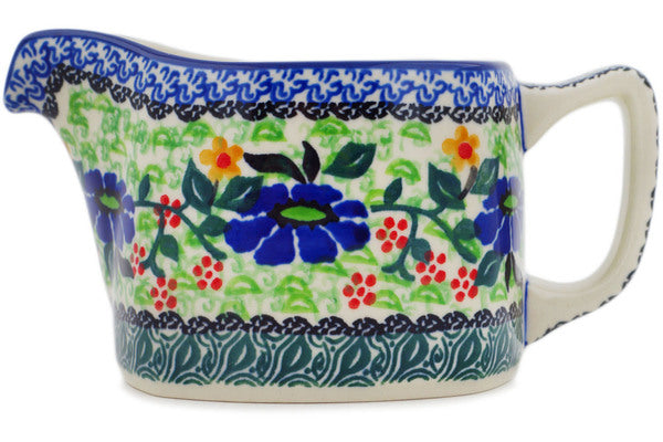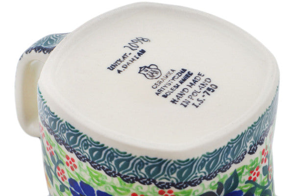 This Poppy Fields 13 oz Creamer was handmade and hand decorated in Boleslawiec, Poland by skilled artisans according to old traditional methods. This is a Polish pottery Signature Unikat, which means that it has been hand painted with both sponges and brushes and it is signed by the artist who painted it. Unikat pieces are the most intricate works of art. Larger Unikat items take hours of very careful work to finish. This Polish stoneware is microwave, dishwasher, freezer, and oven safe up to 480°F. It does not contain lead or cadmium. It is part of the Poppy Fields Collection.