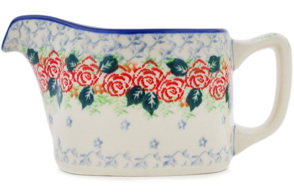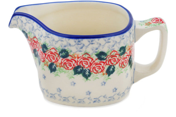 This Rose Wreath 13 oz Creamer was handmade and hand decorated in Boleslawiec, Poland by skilled artisans according to old traditional methods. This is a Polish pottery Signature Unikat, which means that it has been hand painted with both sponges and brushes and it is signed by the artist who painted it. Unikat pieces are the most intricate works of art. Larger Unikat items take hours of very careful work to finish. This Polish stoneware is microwave, dishwasher, freezer, and oven safe up to 480°F. It does not contain lead or cadmium. It is part of the Rose Wreath Collection.