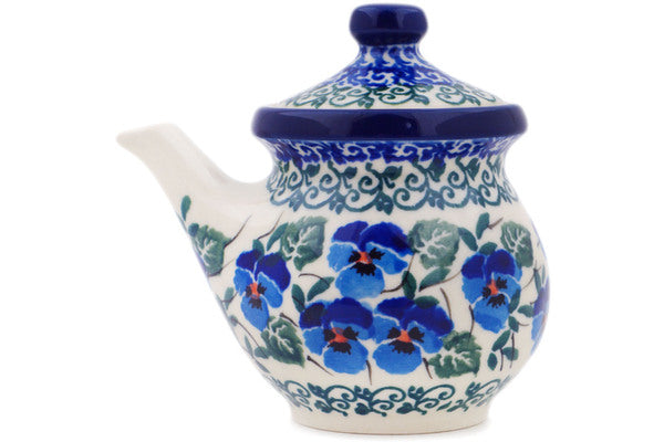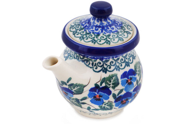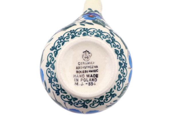 This Blue Pansy 5 oz Creamer with Lid was handmade and hand decorated in Boleslawiec, Poland by skilled artisans according to old traditional methods. This Polish stoneware is microwave, dishwasher, freezer, and oven safe up to 480°F. It does not contain lead or cadmium. It is part of the Blue Pansy Collection.