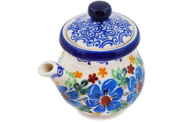 This Sea Of Posies 5 oz Creamer with Lid was handmade and hand decorated in Boleslawiec, Poland by skilled artisans according to old traditional methods. This is a Polish pottery Signature Unikat, which means that it has been hand painted with both sponges and brushes and it is signed by the artist who painted it. Unikat pieces are the most intricate works of art. Larger Unikat items take hours of very careful work to finish. This Polish stoneware is microwave, dishwasher, freezer, and oven safe up to 480°F. It does not contain lead or cadmium. It is part of the Sea Of Posies Collection.