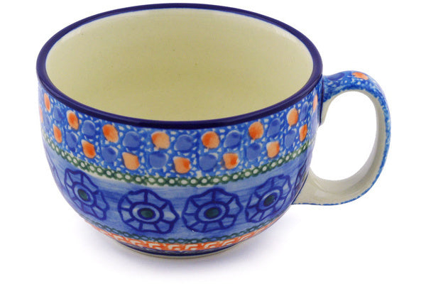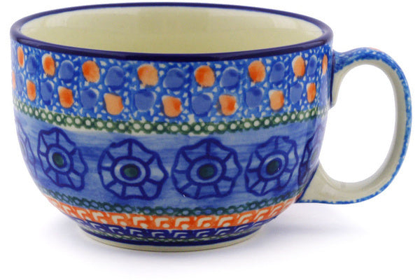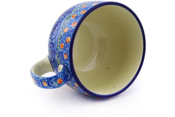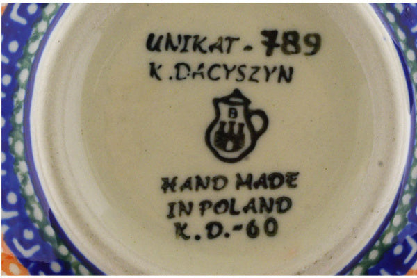 This Midnight Tango 13 oz Cup was handmade and hand decorated in Boleslawiec, Poland by skilled artisans according to old traditional methods. This is a Polish pottery Signature Unikat, which means that it has been hand painted with both sponges and brushes and it is signed by the artist who painted it. Unikat pieces are the most intricate works of art. Larger Unikat items take hours of very careful work to finish. This Polish stoneware is microwave, dishwasher, freezer, and oven safe up to 480°F. It does not contain lead or cadmium. It is part of the Midnight Tango Collection.