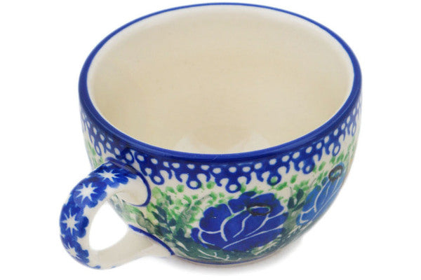 This Brilliant Blue Rose 3 oz Cup was handmade and hand decorated in Boleslawiec, Poland by skilled artisans according to old traditional methods. This is a Polish pottery Signature Unikat, which means that it has been hand painted with both sponges and brushes and it is signed by the artist who painted it. Unikat pieces are the most intricate works of art. Larger Unikat items take hours of very careful work to finish. This Polish stoneware is microwave, dishwasher, freezer, and oven safe up to 480°F. It does not contain lead or cadmium. It is part of the Brilliant Blue Rose Collection.