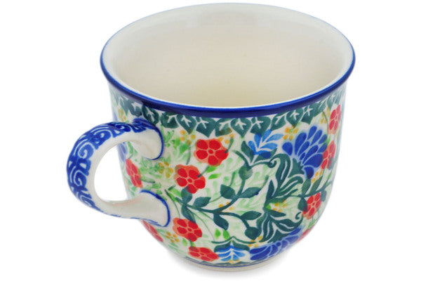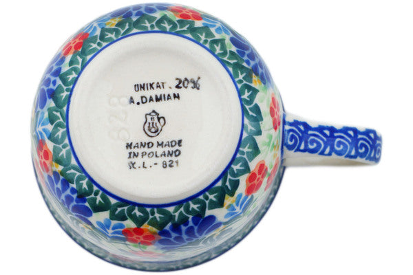 This Blue Bonnets 8 oz Cup was handmade and hand decorated in Boleslawiec, Poland by skilled artisans according to old traditional methods. This is a Polish pottery Signature Unikat, which means that it has been hand painted with both sponges and brushes and it is signed by the artist who painted it. Unikat pieces are the most intricate works of art. Larger Unikat items take hours of very careful work to finish. This Polish stoneware is microwave, dishwasher, freezer, and oven safe up to 480°F. It does not contain lead or cadmium. It is part of the Blue Bonnets Collection.
