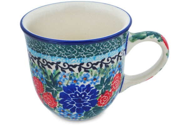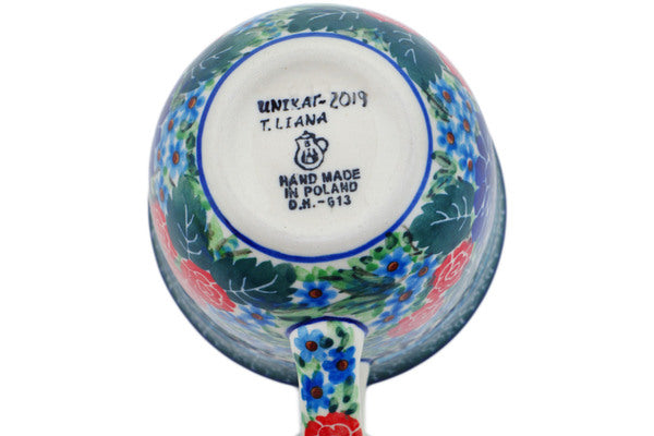 This Garden Trellis 8 oz Cup was handmade and hand decorated in Boleslawiec, Poland by skilled artisans according to old traditional methods. This is a Polish pottery Signature Unikat, which means that it has been hand painted with both sponges and brushes and it is signed by the artist who painted it. Unikat pieces are the most intricate works of art. Larger Unikat items take hours of very careful work to finish. This Polish stoneware is microwave, dishwasher, freezer, and oven safe up to 480°F. It does not contain lead or cadmium. It is part of the Garden Trellis Collection.