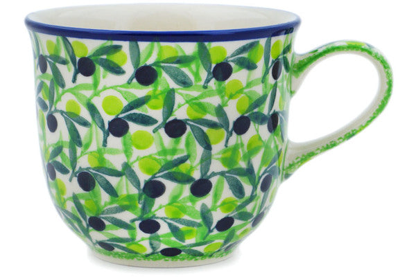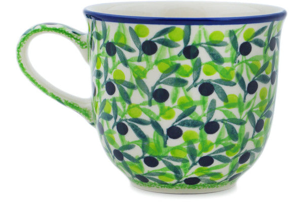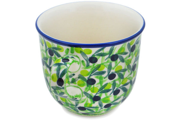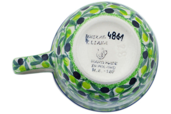 This Olive Grove 8 oz Cup was handmade and hand decorated in Boleslawiec, Poland by skilled artisans according to old traditional methods. This is a Polish pottery Signature Unikat, which means that it has been hand painted with both sponges and brushes and it is signed by the artist who painted it. Unikat pieces are the most intricate works of art. Larger Unikat items take hours of very careful work to finish. This Polish stoneware is microwave, dishwasher, freezer, and oven safe up to 480°F. It does not contain lead or cadmium. It is part of the Olive Grove Collection.