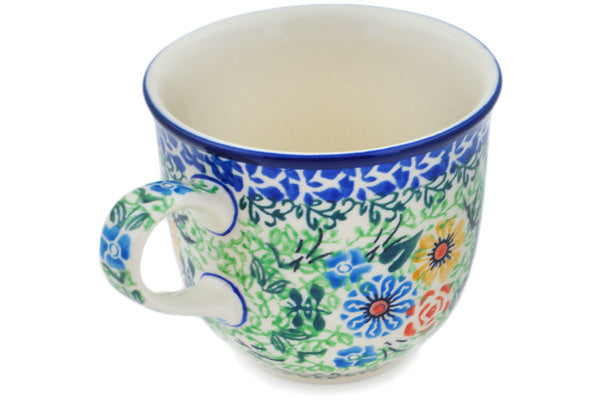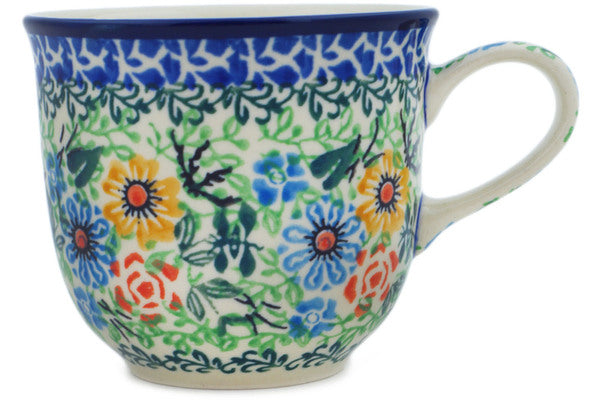 This Spring Wreath 8 oz Cup was handmade and hand decorated in Boleslawiec, Poland by skilled artisans according to old traditional methods. This is a Polish pottery Signature Unikat, which means that it has been hand painted with both sponges and brushes and it is signed by the artist who painted it. Unikat pieces are the most intricate works of art. Larger Unikat items take hours of very careful work to finish. This Polish stoneware is microwave, dishwasher, freezer, and oven safe up to 480°F. It does not contain lead or cadmium. It is part of the Spring Wreath Collection.