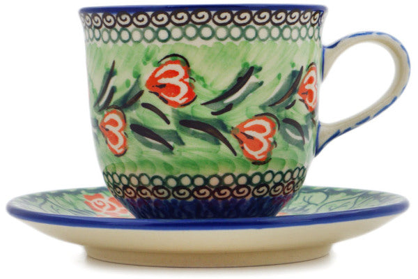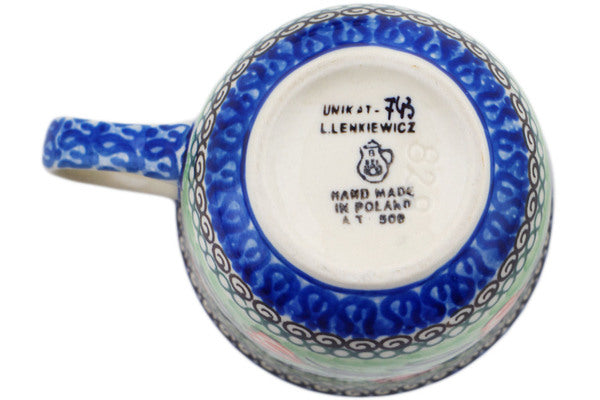 This Tulip Wreath 8 oz Cup was handmade and hand decorated in Boleslawiec, Poland by skilled artisans according to old traditional methods. This is a Polish pottery Signature Unikat, which means that it has been hand painted with both sponges and brushes and it is signed by the artist who painted it. Unikat pieces are the most intricate works of art. Larger Unikat items take hours of very careful work to finish. This Polish stoneware is microwave, dishwasher, freezer, and oven safe up to 480°F. It does not contain lead or cadmium. It is part of the Tulip Wreath Collection.