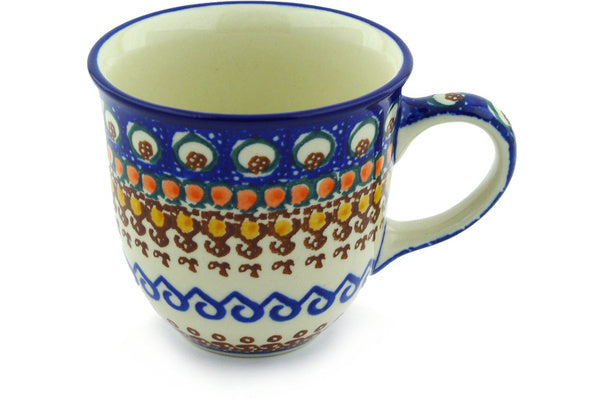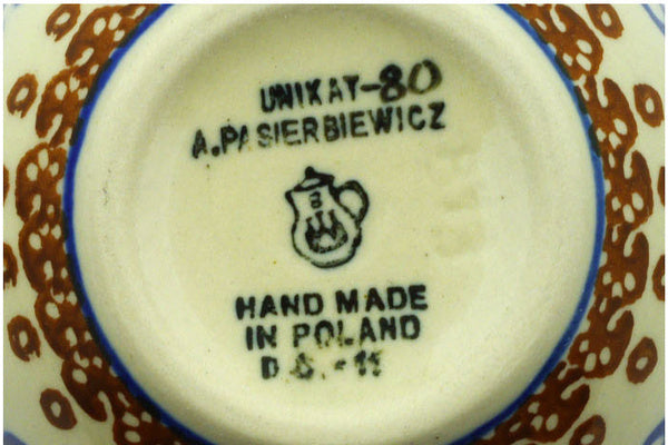 This Western Peacock 8 oz Cup was handmade and hand decorated in Boleslawiec, Poland by skilled artisans according to old traditional methods. This is a Polish pottery Signature Unikat, which means that it has been hand painted with both sponges and brushes and it is signed by the artist who painted it. Unikat pieces are the most intricate works of art. Larger Unikat items take hours of very careful work to finish. This Polish stoneware is microwave, dishwasher, freezer, and oven safe up to 480°F. It does not contain lead or cadmium. It is part of the Western Peacock Collection.
