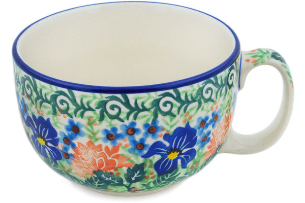 This Midnight Iris 9 oz Cup was handmade and hand decorated in Boleslawiec, Poland by skilled artisans according to old traditional methods. This is a Polish pottery Signature Unikat, which means that it has been hand painted with both sponges and brushes and it is signed by the artist who painted it. Unikat pieces are the most intricate works of art. Larger Unikat items take hours of very careful work to finish. This Polish stoneware is microwave, dishwasher, freezer, and oven safe up to 480°F. It does not contain lead or cadmium. It is part of the Midnight Iris Collection.