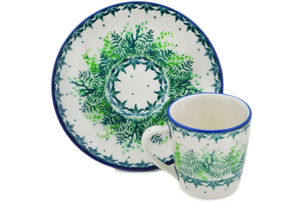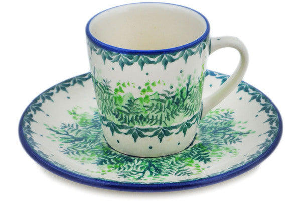 This Fresh Fern 3 oz Cup with Saucer was handmade and hand decorated in Boleslawiec, Poland by skilled artisans according to old traditional methods. This is a Polish pottery Signature Unikat, which means that it has been hand painted with both sponges and brushes and it is signed by the artist who painted it. Unikat pieces are the most intricate works of art. Larger Unikat items take hours of very careful work to finish. This Polish stoneware is microwave, dishwasher, freezer, and oven safe up to 480°F. It does not contain lead or cadmium. It is part of the Fresh Fern Collection.