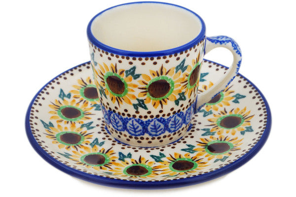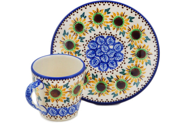 This Golden Autumn 3 oz Cup with Saucer was handmade and hand decorated in Boleslawiec, Poland by skilled artisans according to old traditional methods. This is a Polish pottery Signature Unikat, which means that it has been hand painted with both sponges and brushes and it is signed by the artist who painted it. Unikat pieces are the most intricate works of art. Larger Unikat items take hours of very careful work to finish. This Polish stoneware is microwave, dishwasher, freezer, and oven safe up to 480°F. It does not contain lead or cadmium. It is part of the Golden Autumn Collection.
