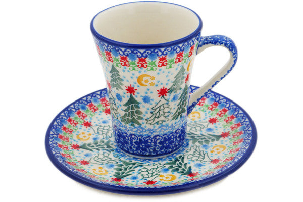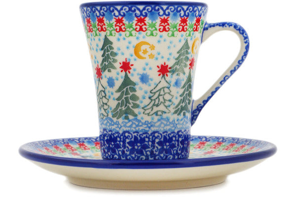 This Glowing Christmas Trees 5 oz Cup with Saucer was handmade and hand decorated in Boleslawiec, Poland by skilled artisans according to old traditional methods. This is a Polish pottery Signature Unikat, which means that it has been hand painted with both sponges and brushes and it is signed by the artist who painted it. Unikat pieces are the most intricate works of art. Larger Unikat items take hours of very careful work to finish. This Polish stoneware is microwave, dishwasher, freezer, and oven safe up to 480°F. It does not contain lead or cadmium. It is part of the Glowing Christmas Trees Collection.