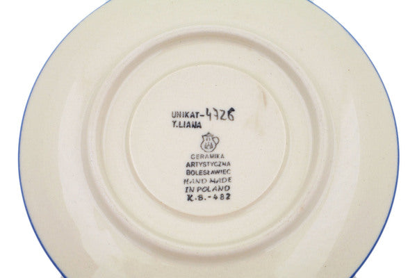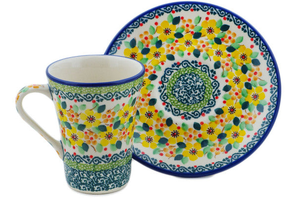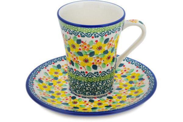 This Happy Thoughts 5 oz Cup with Saucer was handmade and hand decorated in Boleslawiec, Poland by skilled artisans according to old traditional methods. This is a Polish pottery Signature Unikat, which means that it has been hand painted with both sponges and brushes and it is signed by the artist who painted it. Unikat pieces are the most intricate works of art. Larger Unikat items take hours of very careful work to finish. This Polish stoneware is microwave, dishwasher, freezer, and oven safe up to 480°F. It does not contain lead or cadmium. It is part of the Happy Thoughts Collection.