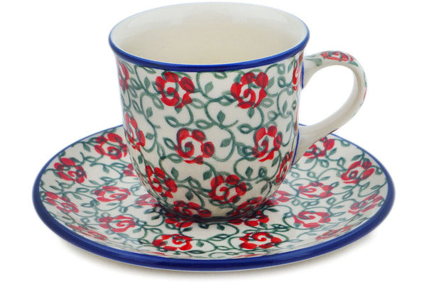 This Rose Vines 7 oz Cup with Saucer was handmade and hand decorated in Boleslawiec, Poland by skilled artisans according to old traditional methods. This is a Polish pottery Signature Unikat, which means that it has been hand painted with both sponges and brushes and it is signed by the artist who painted it. Unikat pieces are the most intricate works of art. Larger Unikat items take hours of very careful work to finish. This Polish stoneware is microwave, dishwasher, freezer, and oven safe up to 480°F. It does not contain lead or cadmium. It is part of the Rose Vines Collection.
