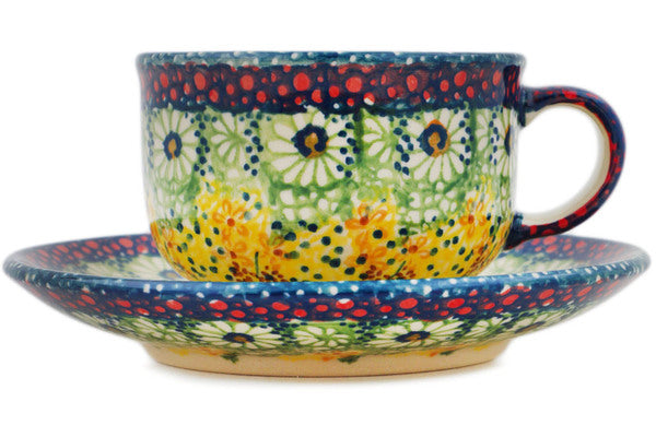 This Sunshine Grotto 7 oz Cup with Saucer was handmade and hand decorated in Boleslawiec, Poland by skilled artisans according to old traditional methods. This is a Polish pottery Signature Unikat, which means that it has been hand painted with both sponges and brushes and it is signed by the artist who painted it. Unikat pieces are the most intricate works of art. Larger Unikat items take hours of very careful work to finish. This Polish stoneware is microwave, dishwasher, freezer, and oven safe up to 480°F. It does not contain lead or cadmium. It is part of the Sunshine Grotto Collection.