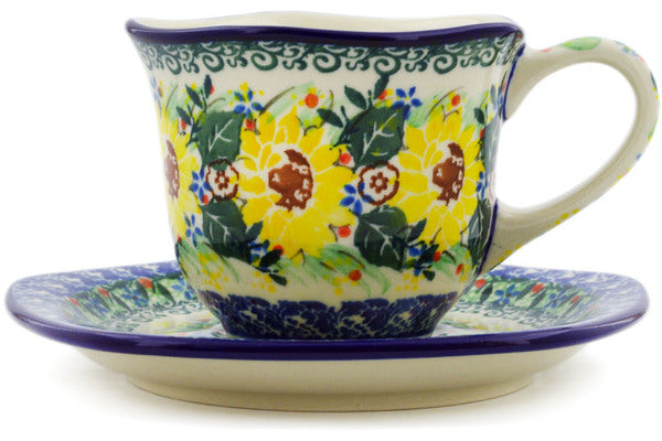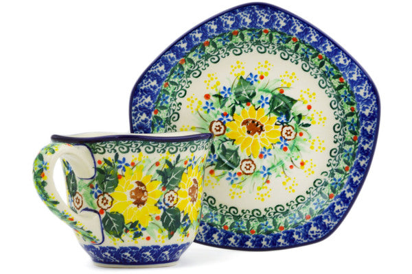 This Yellow Garden 8 oz Cup with Saucer was handmade and hand decorated in Boleslawiec, Poland by skilled artisans according to old traditional methods. This is a Polish pottery Signature Unikat, which means that it has been hand painted with both sponges and brushes and it is signed by the artist who painted it. Unikat pieces are the most intricate works of art. Larger Unikat items take hours of very careful work to finish. This Polish stoneware is microwave, dishwasher, freezer, and oven safe up to 480°F. It does not contain lead or cadmium. It is part of the Yellow Garden Collection.