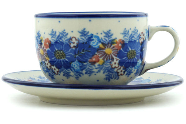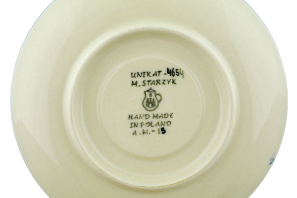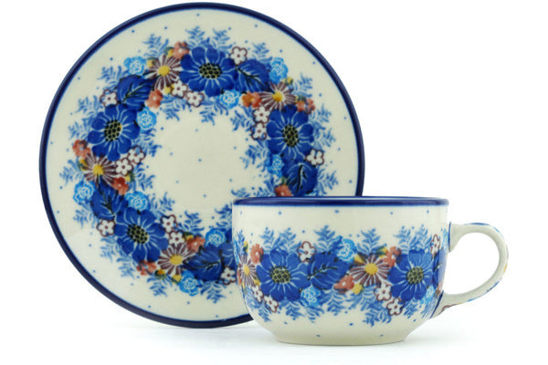 This Flower Wreath 9 oz Cup with Saucer was handmade and hand decorated in Boleslawiec, Poland by skilled artisans according to old traditional methods. This is a Polish pottery Signature Unikat, which means that it has been hand painted with both sponges and brushes and it is signed by the artist who painted it. Unikat pieces are the most intricate works of art. Larger Unikat items take hours of very careful work to finish. This Polish stoneware is microwave, dishwasher, freezer, and oven safe up to 480°F. It does not contain lead or cadmium. It is part of the Flower Wreath Collection.