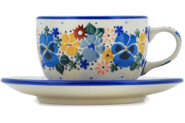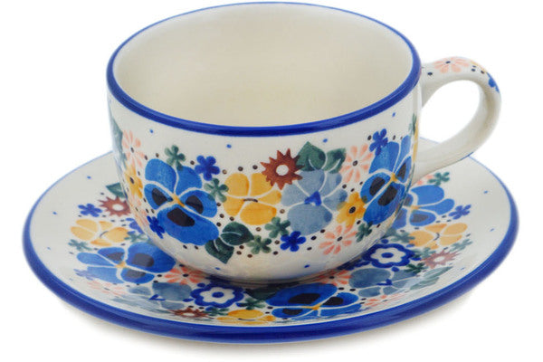 This Pansy Wreath 9 oz Cup with Saucer was handmade and hand decorated in Boleslawiec, Poland by skilled artisans according to old traditional methods. This is a Polish pottery Signature Unikat, which means that it has been hand painted with both sponges and brushes and it is signed by the artist who painted it. Unikat pieces are the most intricate works of art. Larger Unikat items take hours of very careful work to finish. This Polish stoneware is microwave, dishwasher, freezer, and oven safe up to 480°F. It does not contain lead or cadmium. It is part of the Pansy Wreath Collection.