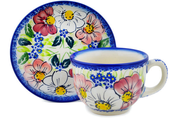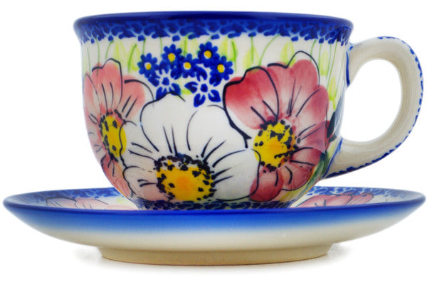 This Maroon Blossoms Cup with Saucer was handmade and hand decorated in Boleslawiec, Poland by skilled artisans according to old traditional methods. This is a Polish pottery Signature Unikat, which means that it has been hand painted with both sponges and brushes and it is signed by the artist who painted it. Unikat pieces are the most intricate works of art. Larger Unikat items take hours of very careful work to finish. This Polish stoneware is microwave, dishwasher, freezer, and oven safe up to 480°F. It does not contain lead or cadmium. It is part of the Maroon Blossoms Collection.