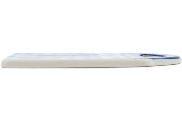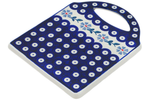 This Peacock Forget-Me-Not 8" Cutting Board was handmade and hand decorated in Boleslawiec, Poland by skilled artisans according to old traditional methods. This Polish stoneware is microwave, dishwasher, freezer, and oven safe up to 480°F. It does not contain lead or cadmium. It is part of the Peacock Forget-Me-Not Collection.