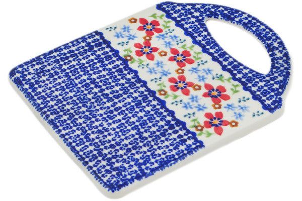 This Red Flower Meadow 8" Cutting Board was handmade and hand decorated in Boleslawiec, Poland by skilled artisans according to old traditional methods. This Polish stoneware is microwave, dishwasher, freezer, and oven safe up to 480°F. It does not contain lead or cadmium. It is part of the Red Flower Meadow Collection.