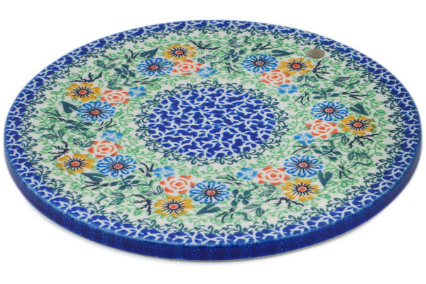 This Spring Wreath 8" Cutting Board was handmade and hand decorated in Boleslawiec, Poland by skilled artisans according to old traditional methods. This is a Polish pottery Signature Unikat, which means that it has been hand painted with both sponges and brushes and it is signed by the artist who painted it. Unikat pieces are the most intricate works of art. Larger Unikat items take hours of very careful work to finish. This Polish stoneware is microwave, dishwasher, freezer, and oven safe up to 480°F. It does not contain lead or cadmium. It is part of the Spring Wreath Collection.
