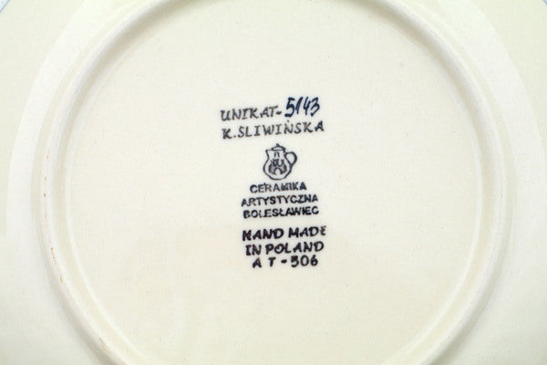 This Jovial 8" Dessert Plate was handmade and hand decorated in Boleslawiec, Poland by skilled artisans according to old traditional methods. This is a Polish pottery Signature Unikat, which means that it has been hand painted with both sponges and brushes and it is signed by the artist who painted it. Unikat pieces are the most intricate works of art. Larger Unikat items take hours of very careful work to finish. This Polish stoneware is microwave, dishwasher, freezer, and oven safe up to 480°F. It does not contain lead or cadmium. It is part of the Jovial Collection.