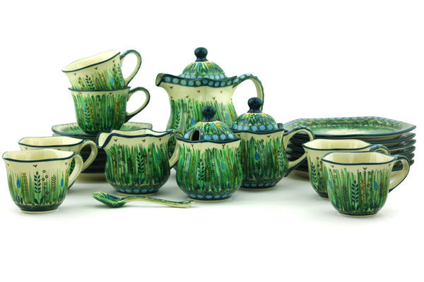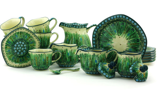 This Prairie Land 29 oz Dessert Set for 6 was handmade and hand decorated in Boleslawiec, Poland by skilled artisans according to old traditional methods. This is a Polish pottery Signature Unikat, which means that it has been hand painted with both sponges and brushes and it is signed by the artist who painted it. Unikat pieces are the most intricate works of art. Larger Unikat items take hours of very careful work to finish. This Polish stoneware is microwave, dishwasher, freezer, and oven safe up to 480°F. It does not contain lead or cadmium. It is part of the Prairie Land Collection.