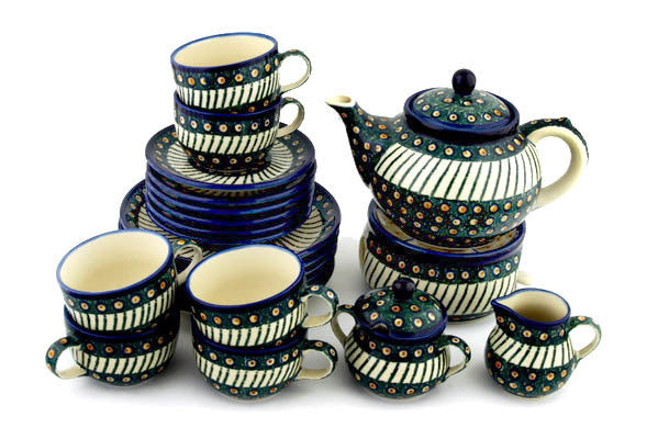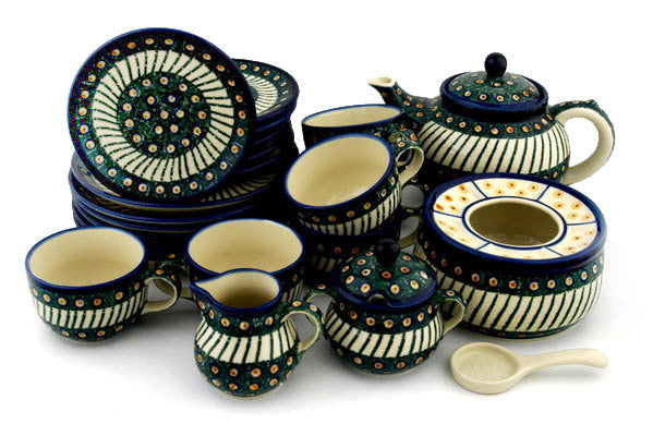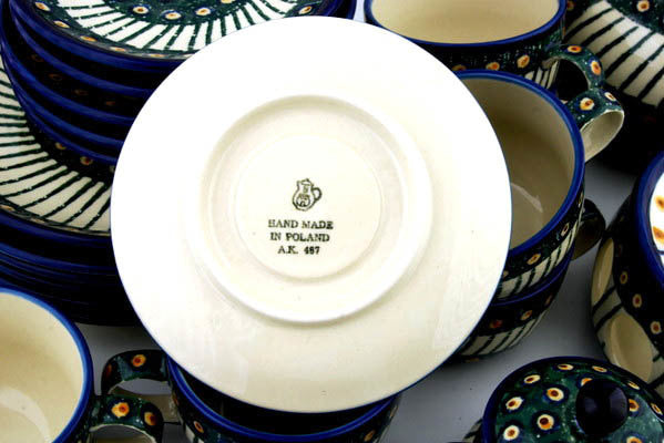 This Emerald Peacock 40 oz Dessert Set for 6 with Heater was handmade and hand decorated in Boleslawiec, Poland by skilled artisans according to old traditional methods. This Polish stoneware is microwave, dishwasher, freezer, and oven safe up to 480°F. It does not contain lead or cadmium. It is part of the Emerald Peacock Collection.