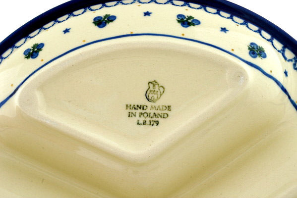 This Blueberry Stars 10" Divided Dish was handmade and hand decorated in Boleslawiec, Poland by skilled artisans according to old traditional methods. This Polish stoneware is microwave, dishwasher, freezer, and oven safe up to 480°F. It does not contain lead or cadmium. It is part of the Blueberry Stars Collection.