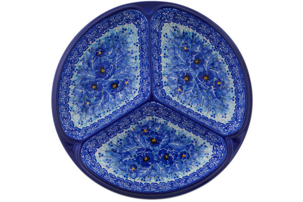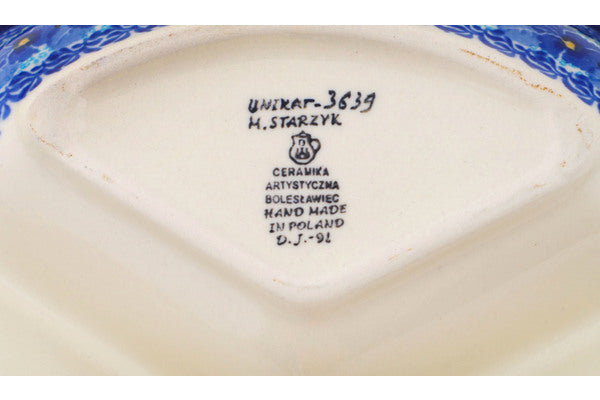 This Deep Winter 10" Divided Dish was handmade and hand decorated in Boleslawiec, Poland by skilled artisans according to old traditional methods. This is a Polish pottery Signature Unikat, which means that it has been hand painted with both sponges and brushes and it is signed by the artist who painted it. Unikat pieces are the most intricate works of art. Larger Unikat items take hours of very careful work to finish. This Polish stoneware is microwave, dishwasher, freezer, and oven safe up to 480°F. It does not contain lead or cadmium. It is part of the Deep Winter Collection.