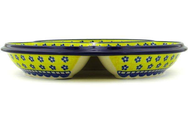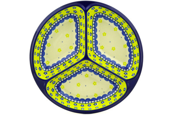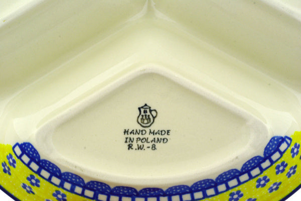 This Sunshine Daisies 10" Divided Dish was handmade and hand decorated in Boleslawiec, Poland by skilled artisans according to old traditional methods. This Polish stoneware is microwave, dishwasher, freezer, and oven safe up to 480°F. It does not contain lead or cadmium. It is part of the Sunshine Daisies Collection.