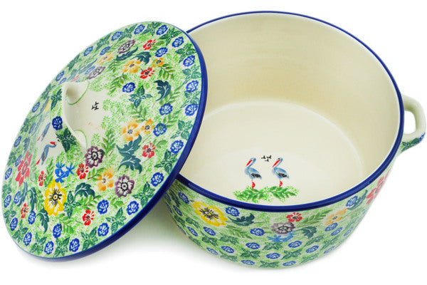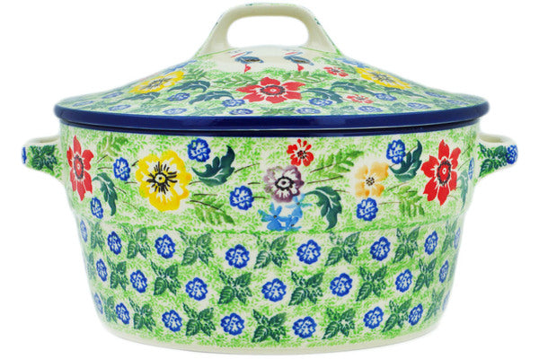 This Springing Into Life 8-inch Dutch Oven was handmade and hand decorated in Boleslawiec, Poland by skilled artisans according to old traditional methods. This is a Polish pottery Signature Unikat, which means that it has been hand painted with both sponges and brushes and it is signed by the artist who painted it. Unikat pieces are the most intricate works of art. Larger Unikat items take hours of very careful work to finish. This Polish stoneware is microwave, dishwasher, freezer, and oven safe up to 480°F. It does not contain lead or cadmium. It is part of the Springing Into Life Collection.