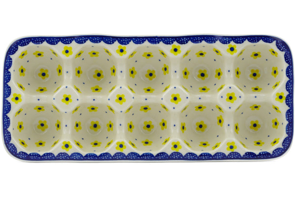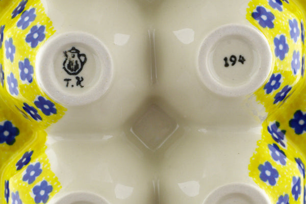 This Sunshine 11" Egg Crate was handmade and hand decorated in Boleslawiec, Poland by skilled artisans according to old traditional methods. This Polish stoneware is microwave, dishwasher, freezer, and oven safe up to 480°F. It does not contain lead or cadmium. It is part of the Sunshine Collection.