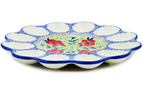 This Rainbow Field 10" Egg Plate was handmade and hand decorated in Boleslawiec, Poland by skilled artisans according to old traditional methods. This is a Polish pottery Signature Unikat, which means that it has been hand painted with both sponges and brushes and it is signed by the artist who painted it. Unikat pieces are the most intricate works of art. Larger Unikat items take hours of very careful work to finish. This Polish stoneware is microwave, dishwasher, freezer, and oven safe up to 480°F. It does not contain lead or cadmium. It is part of the Rainbow Field Collection.