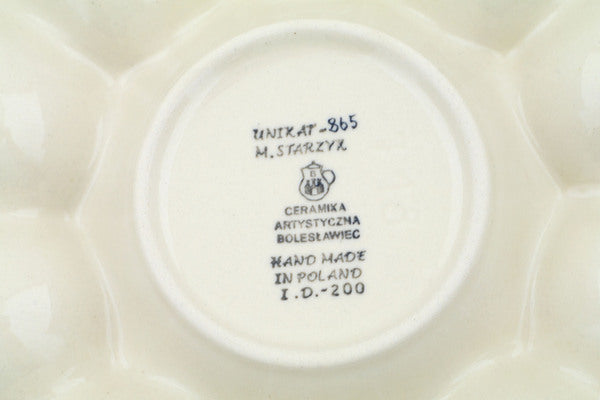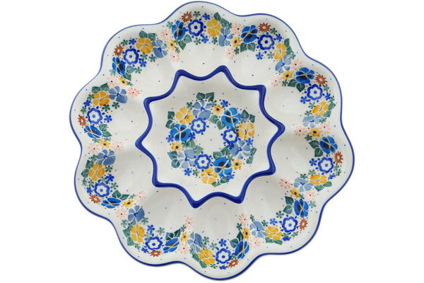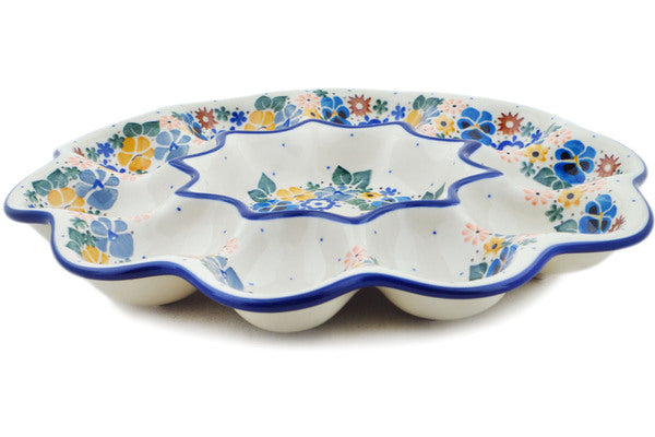 This Pansy Wreath 11" Egg Plate was handmade and hand decorated in Boleslawiec, Poland by skilled artisans according to old traditional methods. This is a Polish pottery Signature Unikat, which means that it has been hand painted with both sponges and brushes and it is signed by the artist who painted it. Unikat pieces are the most intricate works of art. Larger Unikat items take hours of very careful work to finish. This Polish stoneware is microwave, dishwasher, freezer, and oven safe up to 480°F. It does not contain lead or cadmium. It is part of the Pansy Wreath Collection.